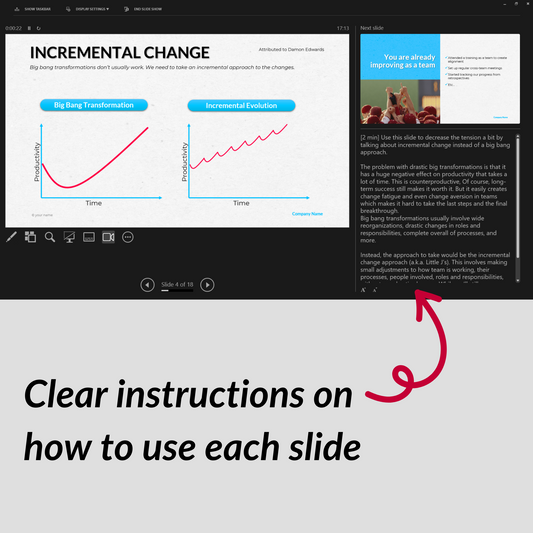 Get step-by-step guidance on how to facilitate meetings, workshops and retrospectives, with templates in Miro or PowerPoint.